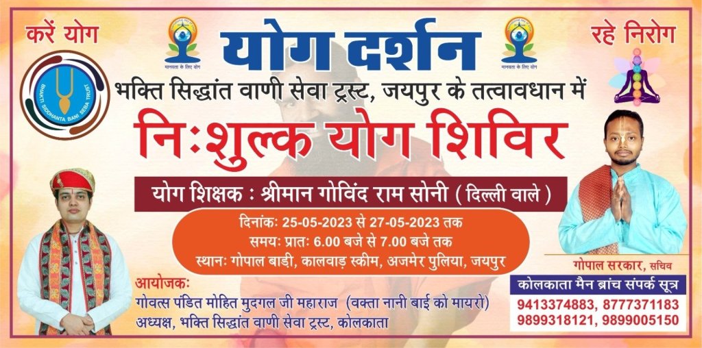 भक्ति सिद्धांत वाणी सेवा ट्रस्ट के तत्वाधान में जयपुर में आयोजन होने जा रहा है निःशुल्क योग शिविर कार्यक्रम